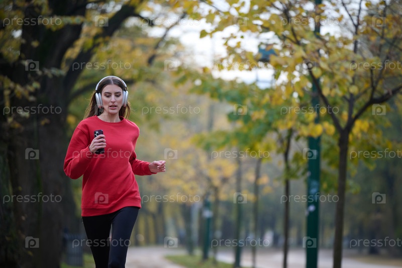 Молодая красивая женщина бежит в осеннем парке и слушает музыку в наушниках на смартфоне