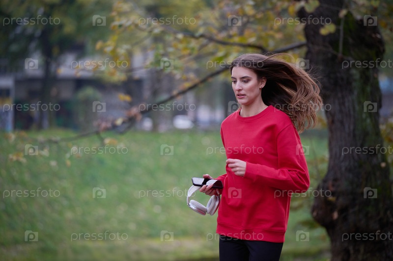 Молодая красивая женщина бежит в осеннем парке и слушает музыку в наушниках на смартфоне