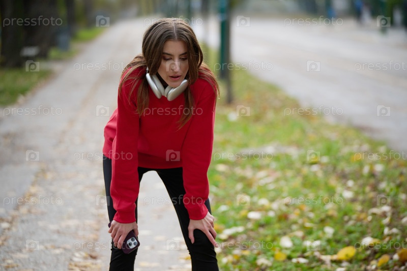 Спортивная молодая женщина делает вдох и расслабляется после пробежки и растяжки. Тренировка женщины и упражнения для тренировки на улице