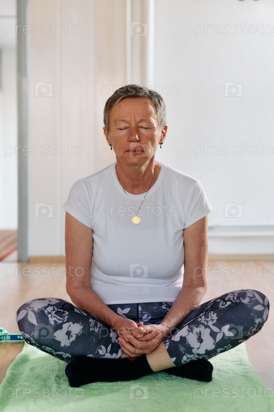 Группа пожилых женщин вместе выполняют упражнения йоги на растяжку шеи, чтобы поддерживать здоровый и активный образ жизни