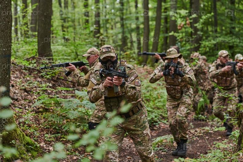 Дисциплинированное и специализированное военное подразделение, облаченное в камуфляж, осуществляющее стратегическое патрулирование и сохраняющее контроль в обстановке с высокими ставками, демонстрирующее свою точность, сплоченность и готовность к специаль
