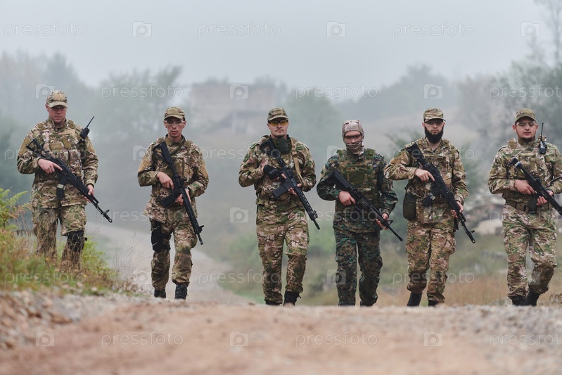 Дисциплинированное и специализированное военное подразделение, облаченное в камуфляж, осуществляющее стратегическое патрулирование и сохраняющее контроль в обстановке с высокими ставками, демонстрирующее свою точность, сплоченность и готовность к специаль