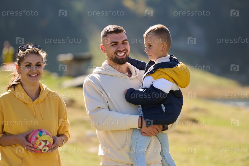Современная семья вместе со своим сыном наслаждается радостью грязного дня на природе, бегая и играя вместе, воплощая в себе красоту здорового и активного образа жизни