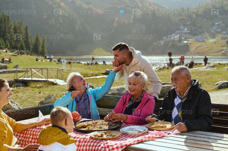 Семья, отдыхающая в горах, наслаждается радостями здорового образа жизни, наслаждаясь традиционным пирогом в окружении захватывающей дух красоты природы, укрепляя семейные узы и наслаждаясь жизненной силой своего горного уединения