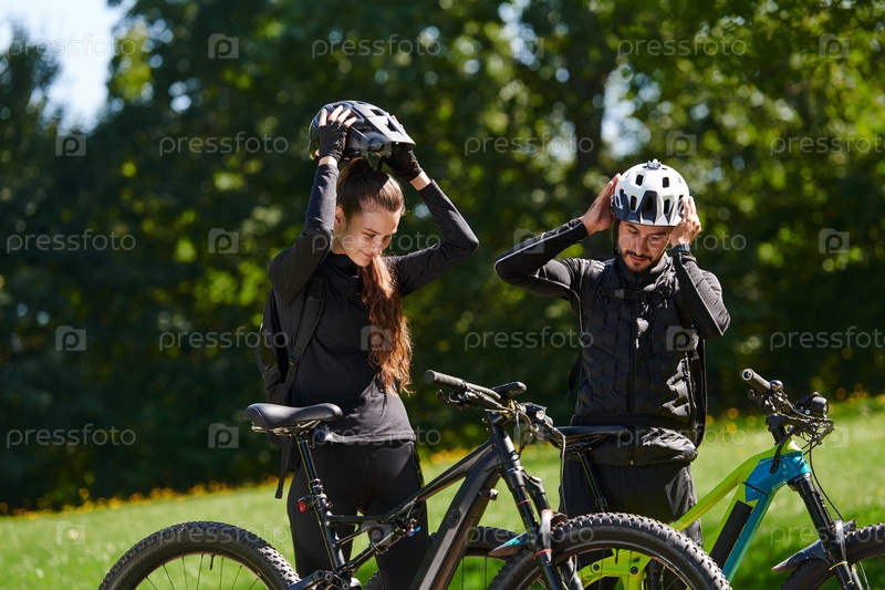 Милая парочка, вооруженная велосипедами и поглощенная планированием своего путешествия, проверяет свои мобильные телефоны и часы, планируя живописные маршруты в парке, органично сочетая технологии и приключения на свежем воздухе для восхитительного опыта