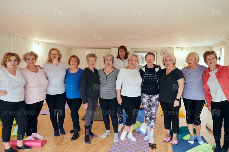 Активное сообщество пожилых женщин под руководством инструктора принимает участие в обогащающем пути йоги, способствуя единению, благополучию и общей приверженности активному старению