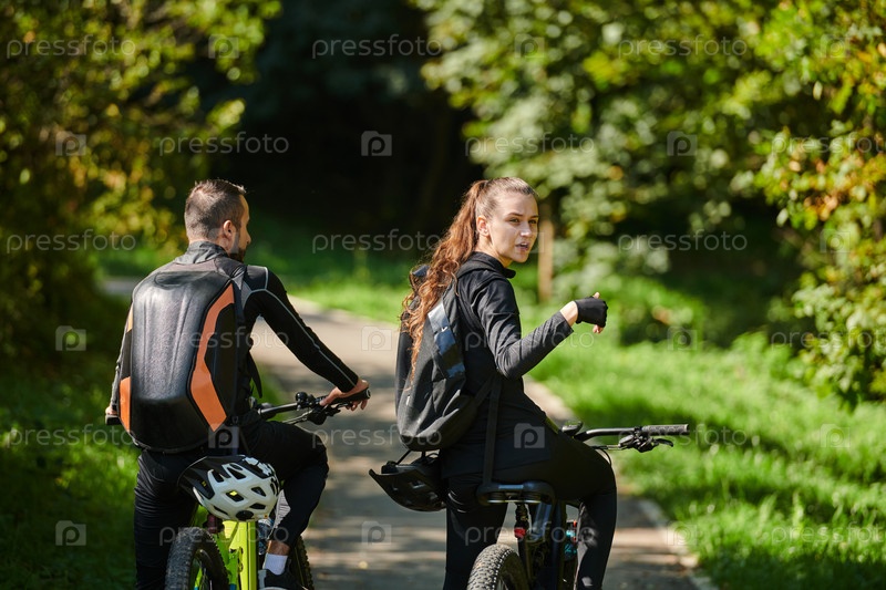 Счастливая пара, одетая в профессиональную велосипедную экипировку, наслаждается романтической велопрогулкой по парку, окруженному современными природными достопримечательностями, излучая любовь и счастье