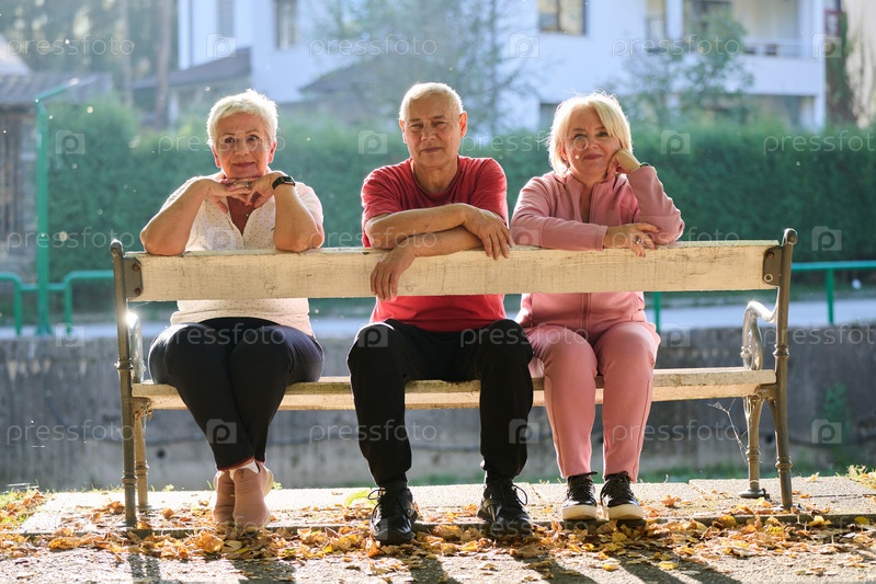 Группа пожилых людей, включая пожилого мужчину и двух пожилых женщин, сидит в парке в солнечный осенний день, воплощая концепцию здорового старения через общение, отдых и активный отдых на свежем воздухе