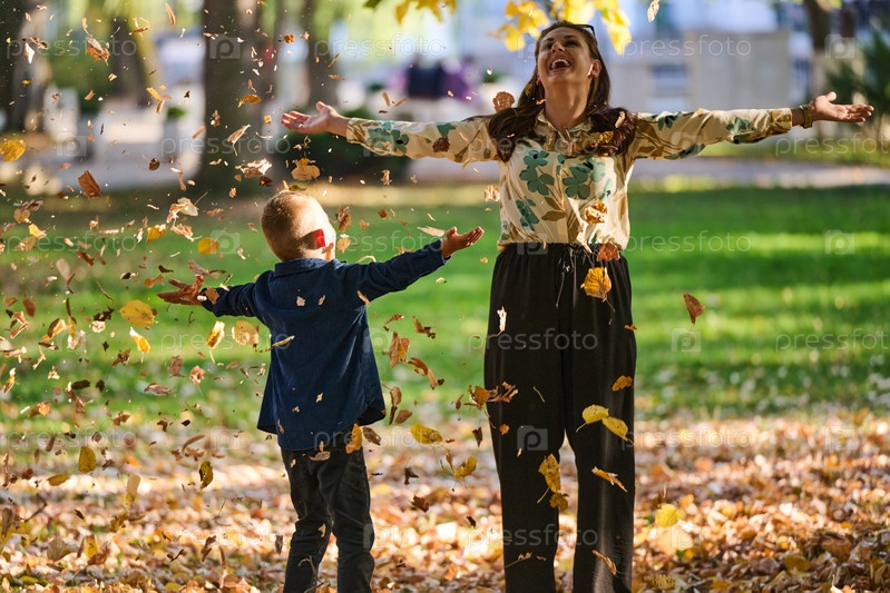 Современная женщина с радостью играет со своим сыном в парке, подбрасывая листья в прекрасный осенний день, запечатлевая суть семейной жизни и теплоту отношений матери и сына в разгар осени