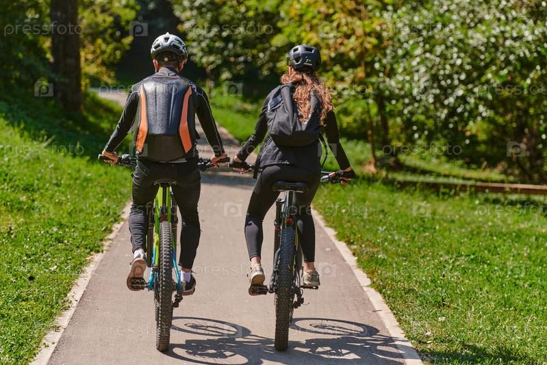 Счастливая пара, одетая в профессиональную велосипедную экипировку, наслаждается романтической велопрогулкой по парку, окруженному современными природными достопримечательностями, излучая любовь и счастье