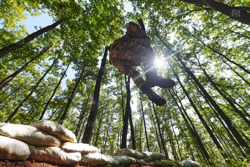 Элитный солдат умело преодолевает военные заграждения в опасной лесистой местности, демонстрируя тактическое мастерство и ловкость во время специализированной подготовки