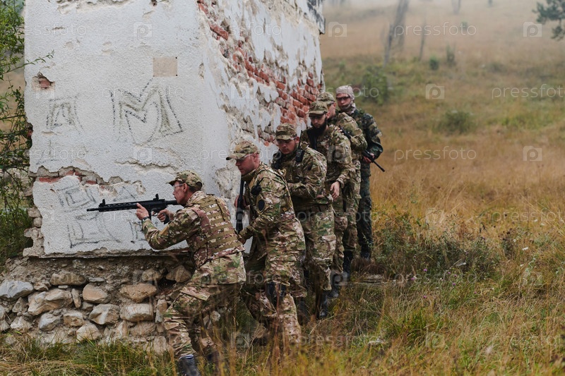 В ходе миссии с высокими ставками специализированное военное подразделение проводит тактическую операцию по обеспечению безопасности опасного дома, где предположительно скрываются террористы, демонстрируя точность и скоординированные маневры