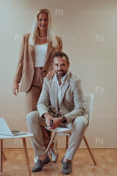 Пара бизнесменов позирует для совместной фотографии на бежевом фоне, запечатлевая свое профессиональное партнерство и создавая вневременной образ единства и успеха