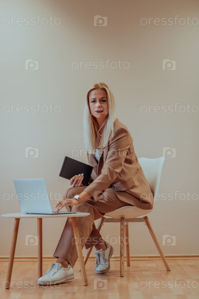 Профессиональная бизнес-леди сидит на стуле на спокойном бежевом фоне, усердно работая на своем ноутбуке, демонстрируя преданность делу и сосредоточенность на достижении успеха