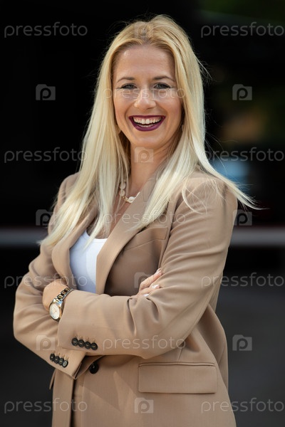 Яркий портрет деловой женщины, уверенно стоящей со скрещенными на груди руками