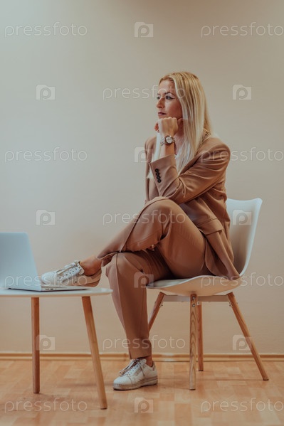 Профессиональная бизнес-леди сидит на стуле на спокойном бежевом фоне, усердно работая на своем ноутбуке, демонстрируя преданность делу и сосредоточенность на достижении успеха