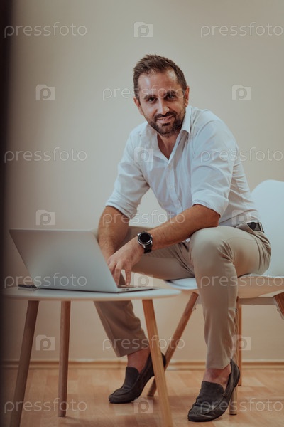 Уверенный в себе бизнесмен сидит и использует ноутбук с решительным выражением лица, а бежевый фон усиливает профессиональную атмосферу, демонстрируя его производительность и опыт