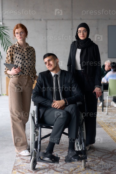Разнообразная бизнес-команда уверенно позирует, включая улыбающегося директора, сидящего в инвалидном кресле, в окружении двух коллег-женщин, одна из которых в хиджабе, а другая держит планшет, в современной офисной обстановке