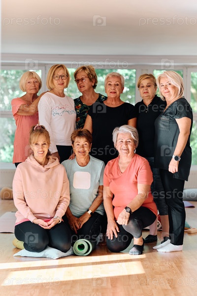 Активное сообщество пожилых женщин под руководством инструктора принимает участие в обогащающем пути йоги, способствуя единению, благополучию и общей приверженности активному старению
