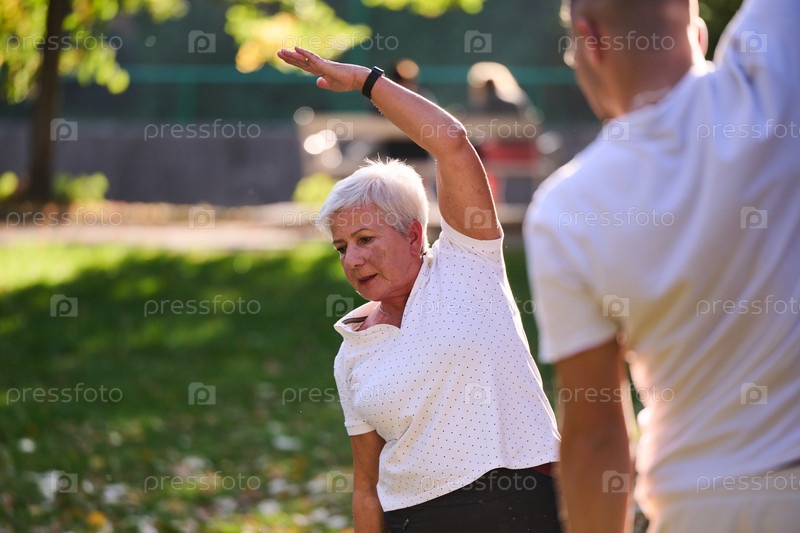 Группа пожилых людей следует за тренером, выполняя упражнения на свежем воздухе в парке, и все вместе они стремятся поддерживать жизненную силу и благополучие, придерживаясь активного и здорового образа жизни в пожилом возрасте