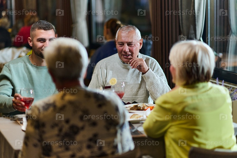 Группа друзей семьи, в которую входят молодой внук и пожилые люди, наслаждаются восхитительным ужином в современном ресторане, демонстрируя концепцию здорового старения через межпоколенческие связи и радостный обеденный опыт