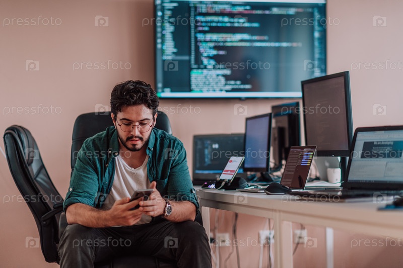 Программист усердно тестирует приложения для смартфонов, сидя в своем офисе