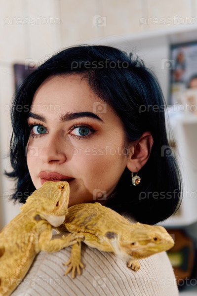 Красивая женщина позирует с двумя очаровательными питомцами — бородатыми агамами