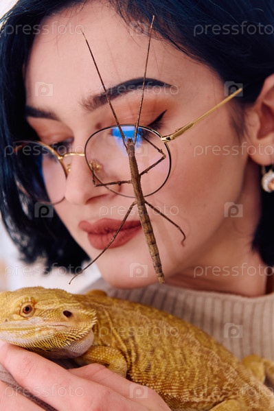 Женщина и ее питомцы: бородатая агама и палочник