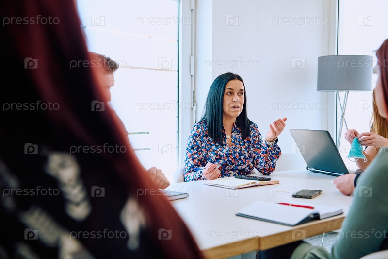 Разнообразная бизнес-группа обсуждает проекты в современном стеклянном офисе