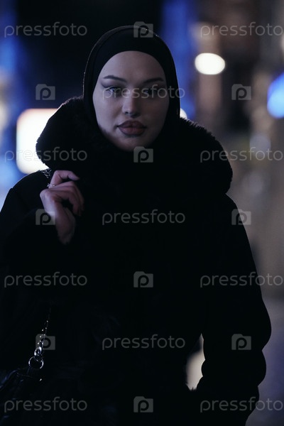 Мусульманка идет по городской улице холодной зимней ночью в хиджабе