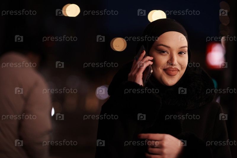Европейская мусульманка в хиджабе, бизнес-леди, проверяет свой телефон на городской улице ночью