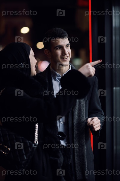 Счастливая мультикультурная деловая пара прогуливается вместе на улице города ночью возле витрины ювелирного магазина