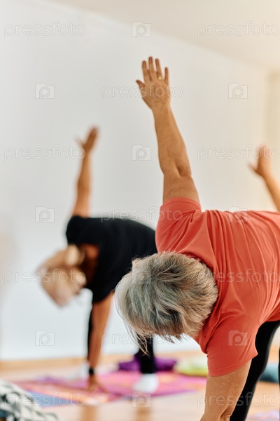 Группа пожилых женщин занимается различными упражнениями йоги, включая растяжку шеи, спины и ног, под руководством тренера в залитом солнцем месте, способствуя благополучию и гармонии
