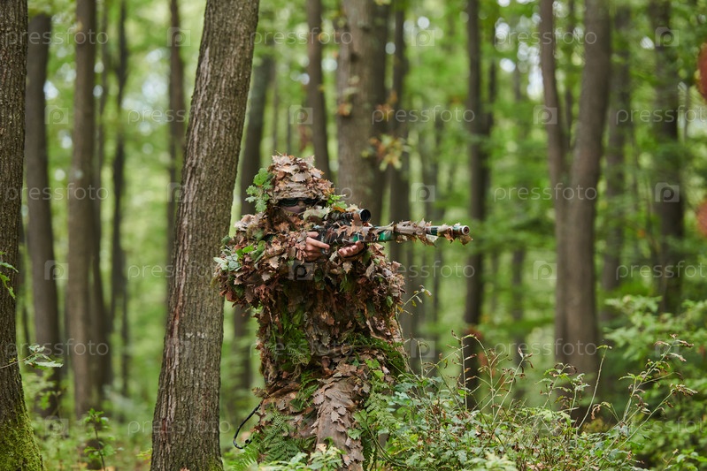 Высококвалифицированный элитный снайпер, замаскированный в густом лесу, скрытно маневрирует по опасной лесной местности, выполняя скрытное и точное задание