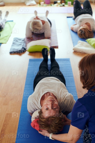 Вид сверху на группу пожилых женщин, которые занимаются различными упражнениями йоги, включая растяжку шеи, спины и ног, под руководством тренера в залитом солнцем месте, способствуя благополучию и гармонии