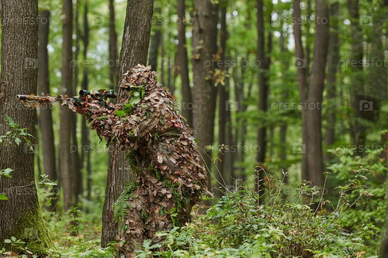 Высококвалифицированный элитный снайпер, замаскированный в густом лесу, скрытно маневрирует по опасной лесной местности, выполняя скрытное и точное задание