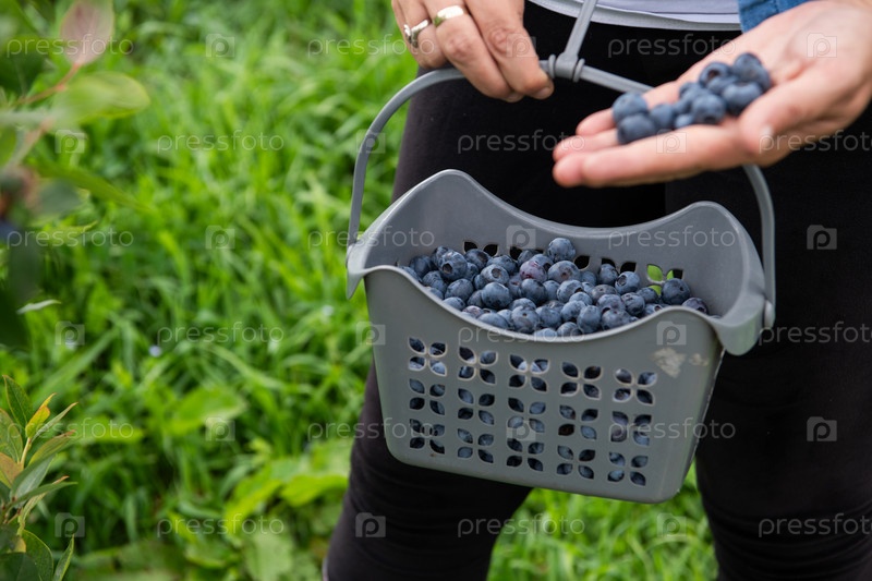 Пожилой фермер несет корзину свежесобранной черники со своей фермы