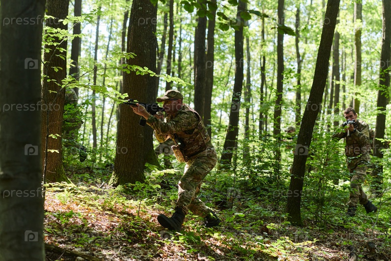 Специализированное военное антитеррористическое подразделение проводит секретную операцию в густом, опасном лесу, демонстрируя точность, дисциплину и стратегическую готовность