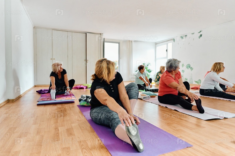 Группа пожилых женщин занимается различными упражнениями йоги, включая растяжку шеи, спины и ног, под руководством тренера в залитом солнцем месте, способствуя благополучию и гармонии