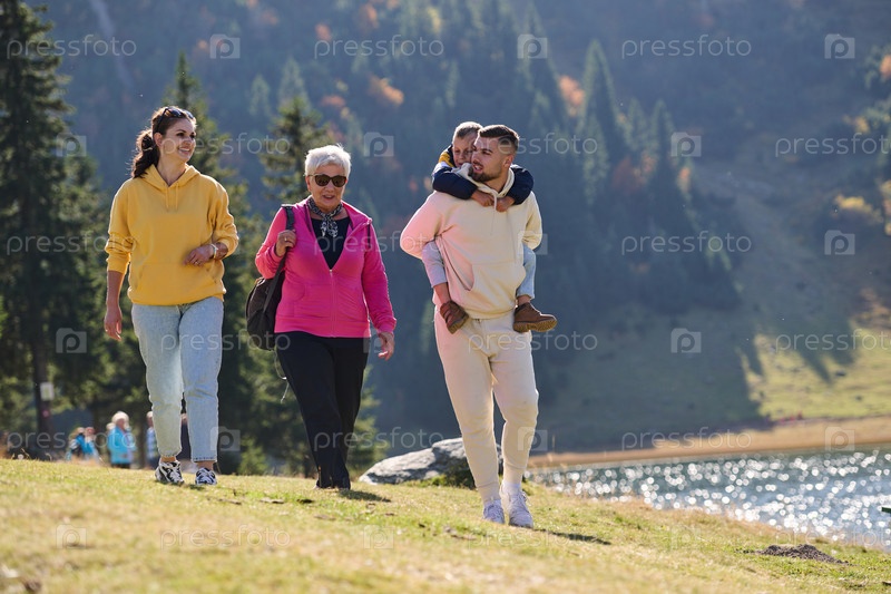 Семья разделяет прекрасные моменты с друзьями на фоне потрясающих пейзажей гор, озер и извилистых троп, пропагандируя здоровый образ жизни и радость семейных уз в объятиях красоты природы