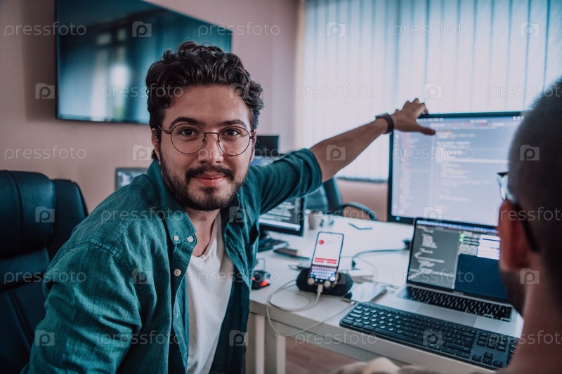 Программисты, погруженные в тесное сотрудничество, усердно трудятся вместе над решением сложных проблем и разработкой инновационных мобильных приложений с безупречной функциональностью