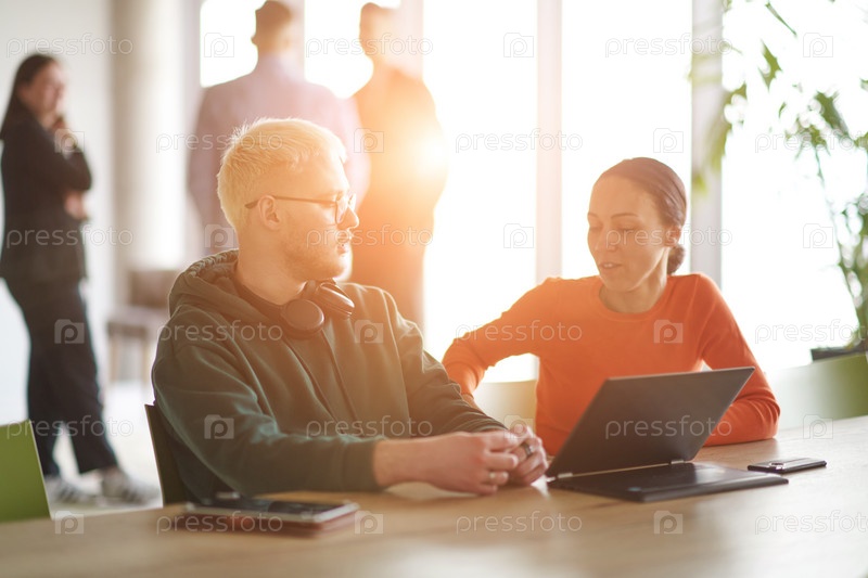 Светловолосый бизнесмен и его коллега сидят в офисе и обсуждают работу, используя ноутбук для совместной работы над задачами