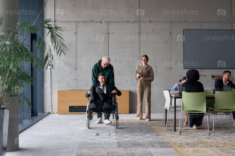 Разнообразная команда коллег по бизнесу, включая директора в инвалидной коляске, участвует в совместной дискуссии, перемещаясь по современному офисному пространству
