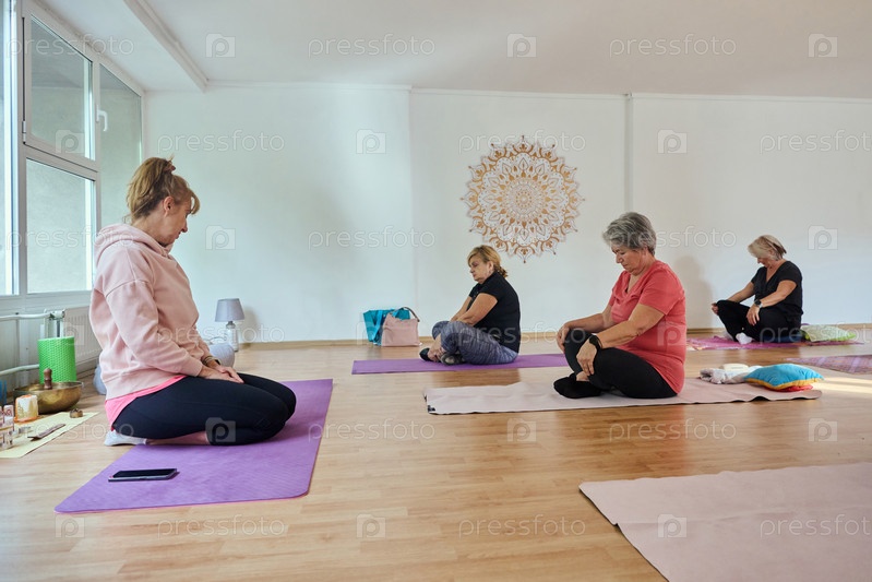 Группа пожилых женщин занимается различными упражнениями йоги, включая растяжку шеи, спины и ног, под руководством тренера в залитом солнцем месте, способствуя благополучию и гармонии