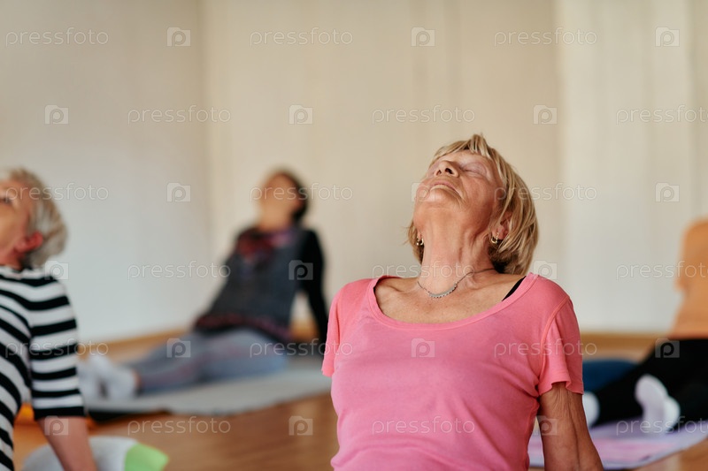 Женщины старшего возраста занимаются оздоровлением: йогой и растяжкой в залитом солнцем пространстве