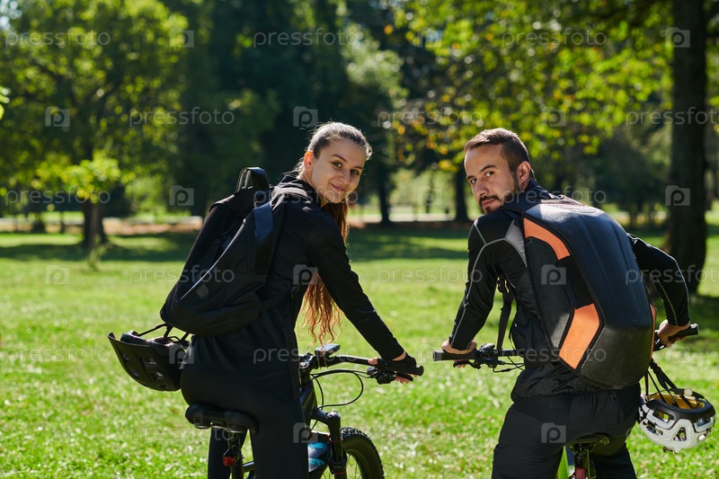 Счастливая пара, одетая в профессиональную велосипедную экипировку, наслаждается романтической велопрогулкой по парку, окруженному современными природными достопримечательностями, излучая любовь и счастье