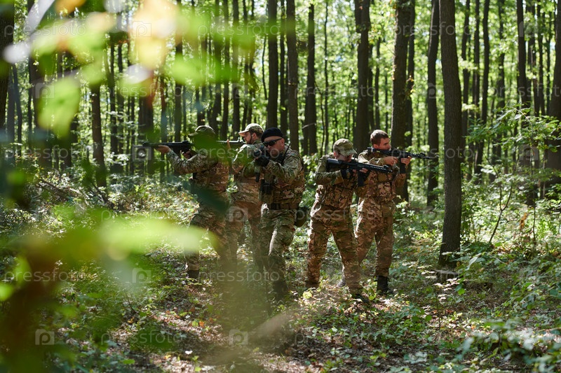 Специализированное военное антитеррористическое подразделение проводит секретную операцию в густом, опасном лесу, демонстрируя точность, дисциплину и стратегическую готовность