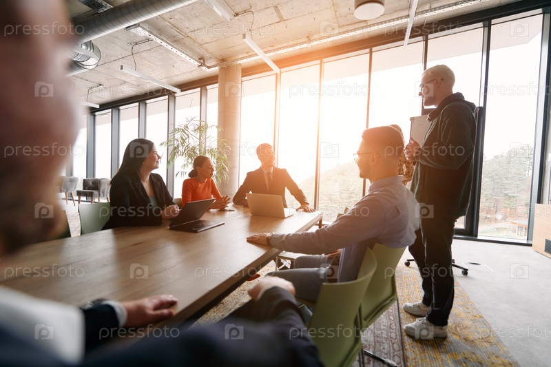 Разнообразная многонациональная бизнес-команда участвует в совместной встрече, обсуждая стратегии и решения в современной офисной обстановке