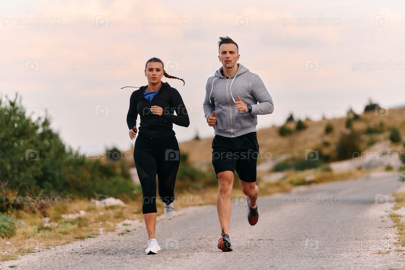 Пара в спортивной одежде бежит по живописной дороге во время утренней тренировки, наслаждаясь свежим воздухом и поддерживая здоровый образ жизни