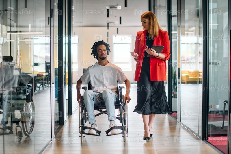 Руководитель бизнеса со своим коллегой, афроамериканским бизнесменом, который является инвалидом, проходят мимо своих коллег, работающих в современных офисах